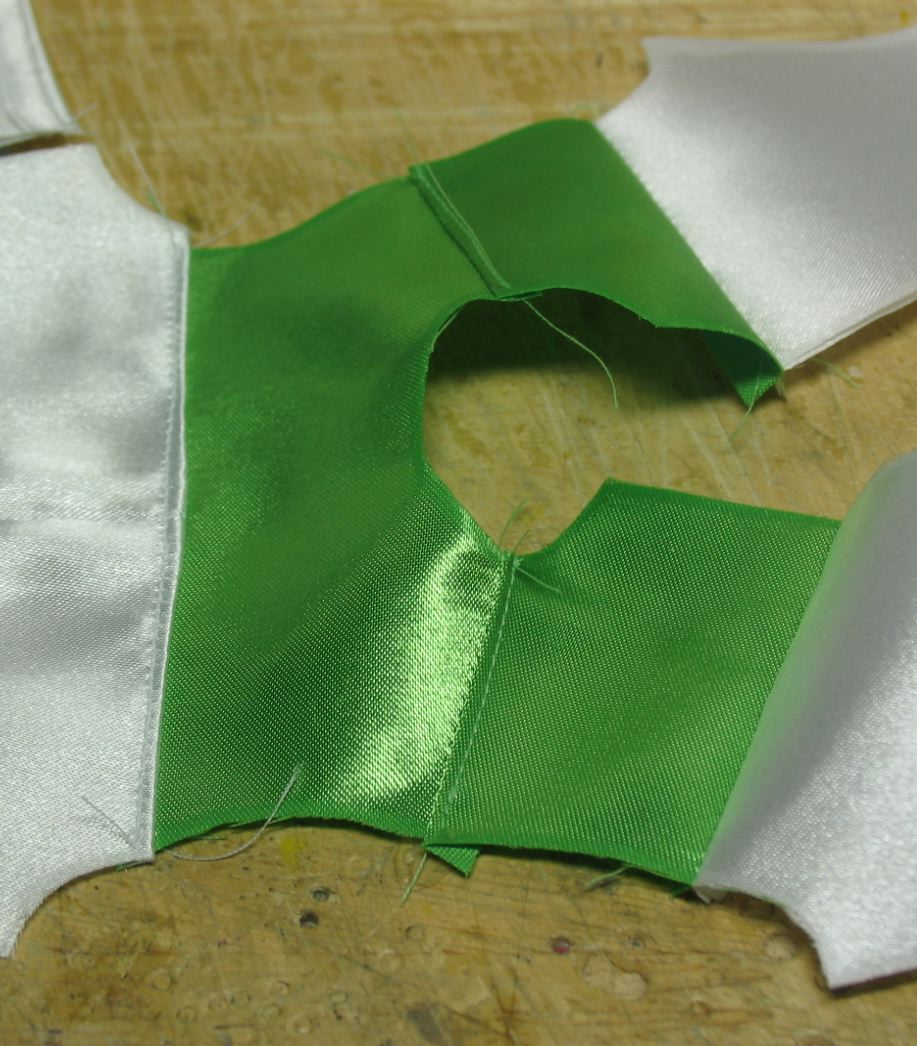 折り込んでステッチを入れた後に後ろ身頃に縫い合せています。