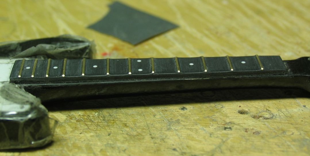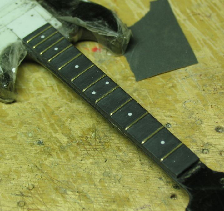 フレットのモールドをそぎ落とし、その位置に溝を切ります。